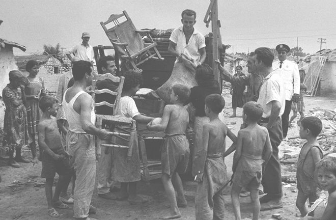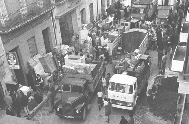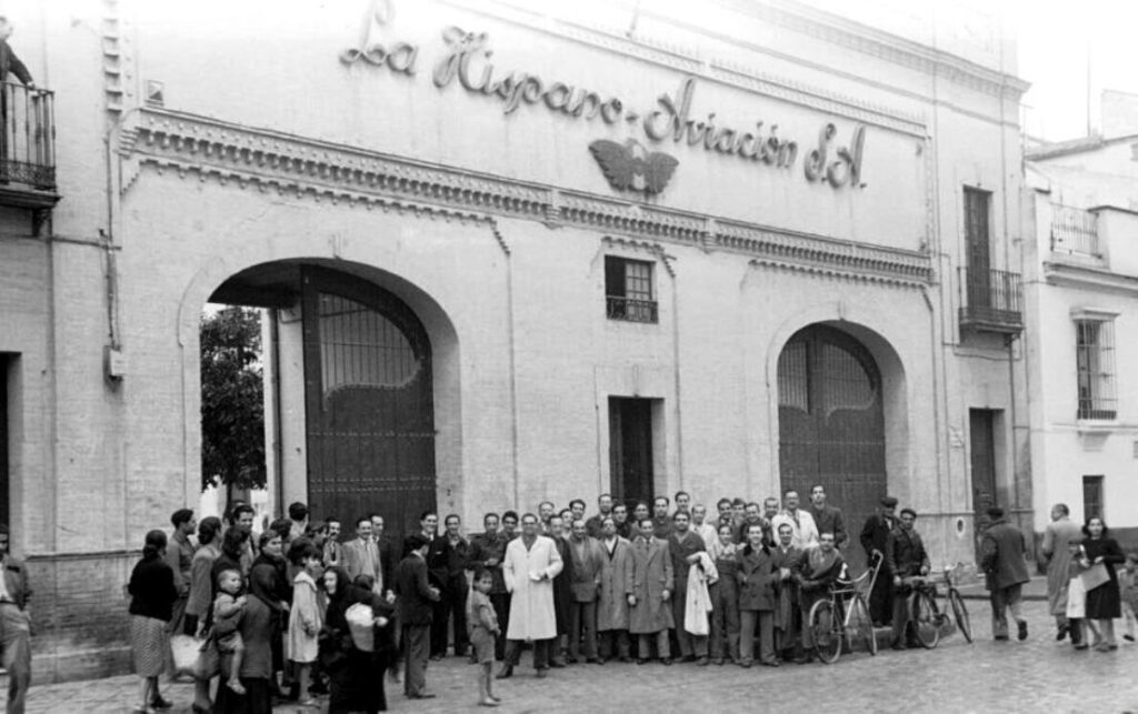 Imagen 1: operarios en la fachada de la portada de la antigua fábrica de aviones «La Hispano-Aviación», en la calle San Jacinto. Imagen 2: Interior de la fábrica.
